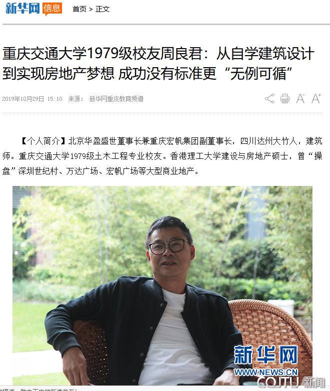新华网重庆教育频道10月29日电2009年,重庆南坪万达广场建成开业;2010年,“离尘不离城”的“凤凰湾”落脚江北农场;2012年,宏帆广场进驻四川广安……这些项目的推进,都与周良君有着密切联系。然而,除去成功人士、地产精英等标签,周良君还是重庆交通大学1979级道桥系杰出校友。近日,在凤凰湾半山俱乐部,他回忆了自己的大学时光,以及自己从想修房子到想做房地产的圆梦历程,并建议青年学生多尝试,多积累,因为成功没有标准更“无例可循”。
