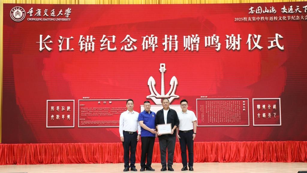 82级轮驾校友代表刘新友、谢国泰向学院捐赠“守望启航(长江锚)”纪念碑,这只1954年便服役于“东方红号”的长江锚配上特意为纪念碑撰写的《轮驾之歌》承载着航运学科的精神传承,体现了校友们的深厚情谊。周德贵书记和吴磊处长接受捐赠并鸣谢。